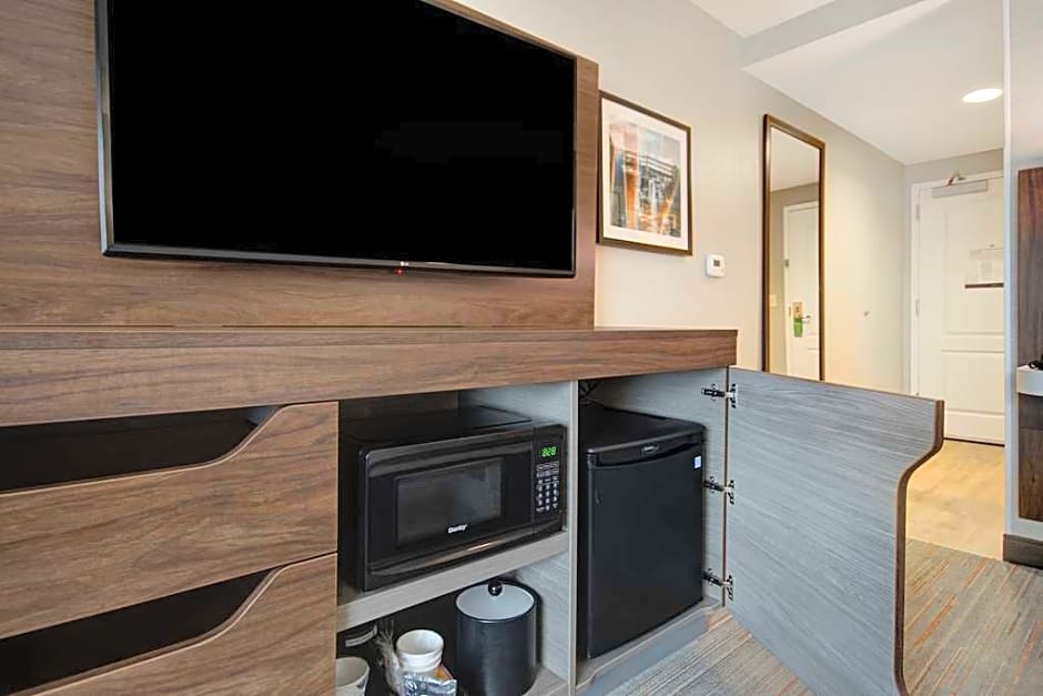 This mobility and hearing accessible, non-smoking room features one king-sized bed, and an accessible roll-in shower. The room also has a visual alarm and notification devices for the doorbell or door knock and incoming phone calls. It features comfortable soft seating, a HDTV, and easy to operate alarm clock/radio. The free WiFi access will help you stay connected while on the road. If you prefer not to work at the desk, you can use the convenient lap desk instead. You'll also enjoy the convenience of having a coffeemaker with tea service and iron/ironing board in your room. Any corresponding photo may not reflect the specific accessible room type or room feature.